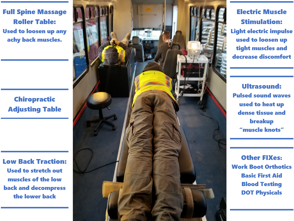 The Chicago FIX Mobile (TCFM) is a one-of-a-kind completely on-site wellness service with PROVEN RESULTS that brings gold standard medical, chiropractic, rehab and preventative care right to the job site weekly.